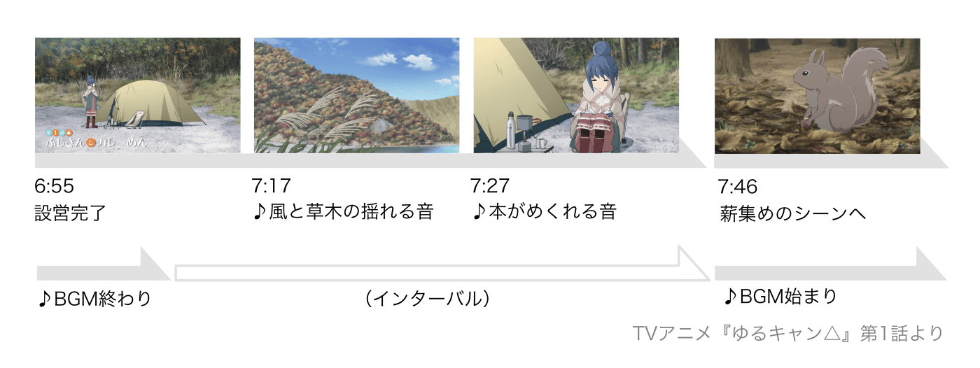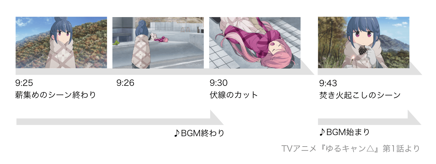 BGMを流すことで逆にBGMが流れない部分を目立たせることもできます。例えばBGMを突然中断する技法はギャグシーンでよく使われていて、このゆるキャン△第1話でも志摩リンとなでしこが初めて会話をするシーンで突然中断するポイントが2か所あります。どちらもなでしこのボケるところで、ちょうどBGMが無くなって無音になったタイミングでお腹の音が響き渡ります。